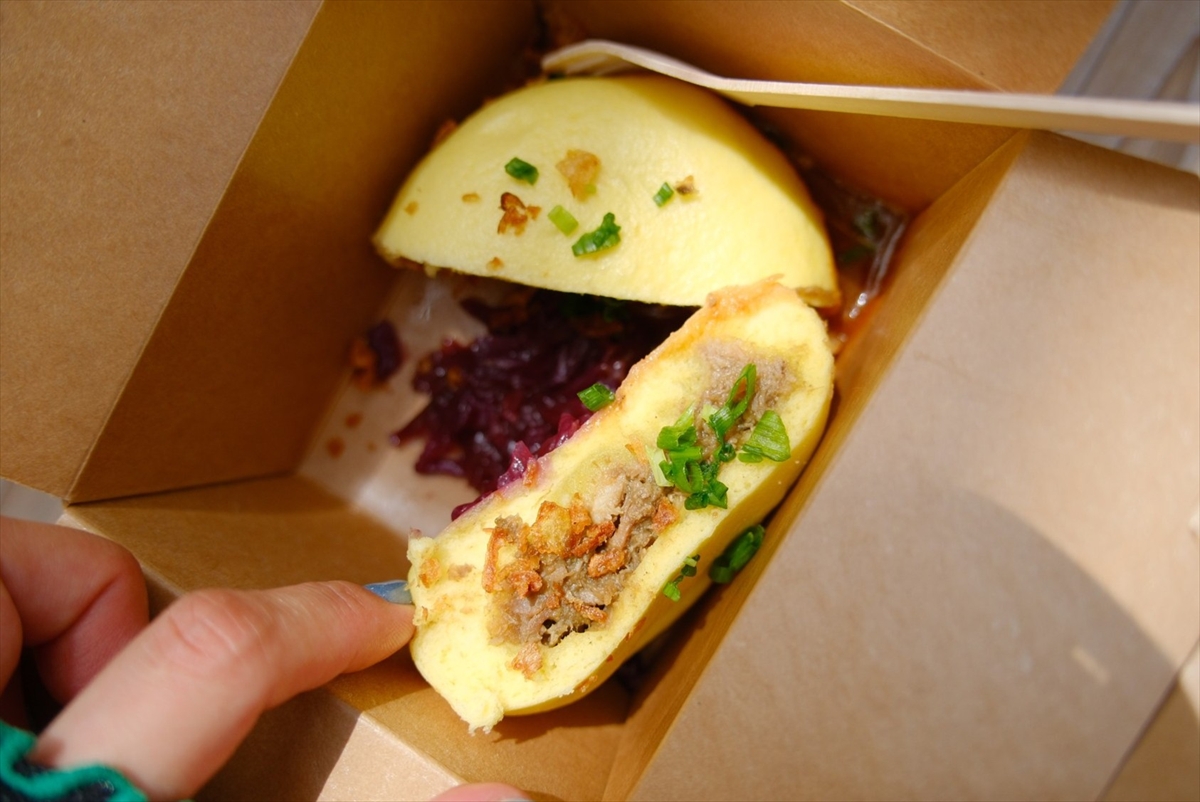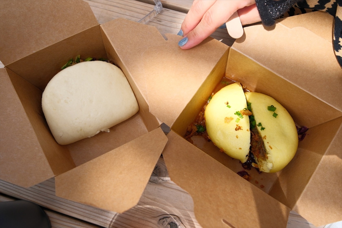 パオは角煮まんスタイルの生地に、柔らかくほぐした鴨肉がサンドされている。甘辛い鴨と甘いキャベツの組み合わせが、ビールにピッタリだ。