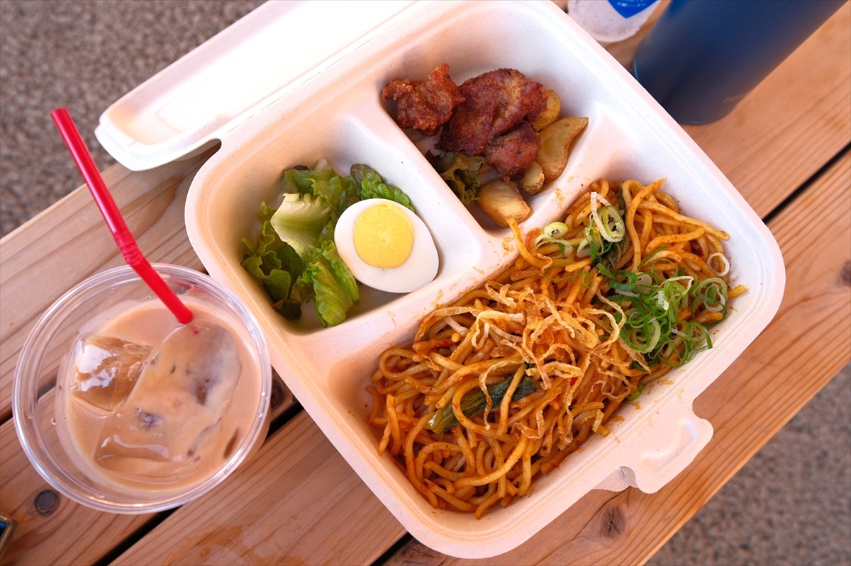 一方ミーゴレンは、ピリ辛な味付けのマレーシア風焼きそば。上の段に入っているから揚げとポテトもガツンとした味付けで美味しく、一気にお腹いっぱいまで持って行けた。
