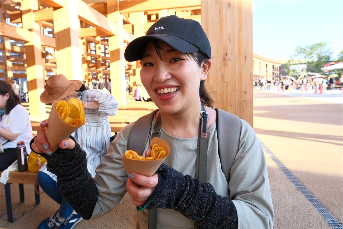パビリオンを回って午後6時。小腹が空いて立ち寄ったのが、電力館の近くにある『ユーハイム』のキッチンカー。4台ほどが稼働しており、名物のバームクーヘンを中心にスイーツや飲み物を提供していた。