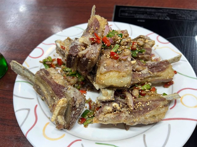 “揚げたラムチョップ” って感じかな? と思いながら食べたら、実際にその通りだった。ただ予想外だったのが、脂がすごいこと。そして、薬味的に添えられている野菜だ。