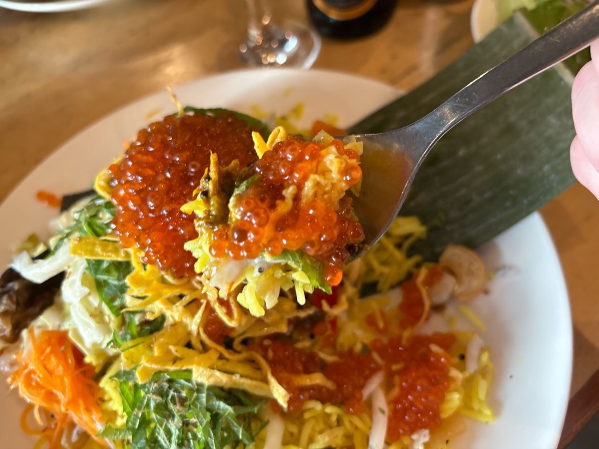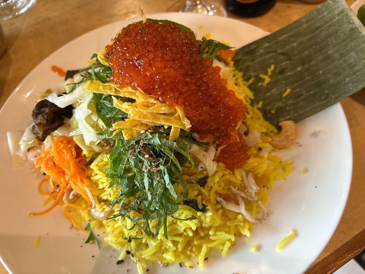 イクラの赤、大葉の緑、レモンライスの黄色が映える。見た目は完全にちらし寿司寄り。いやぁ~……改めてとんでもないインパクトだ。