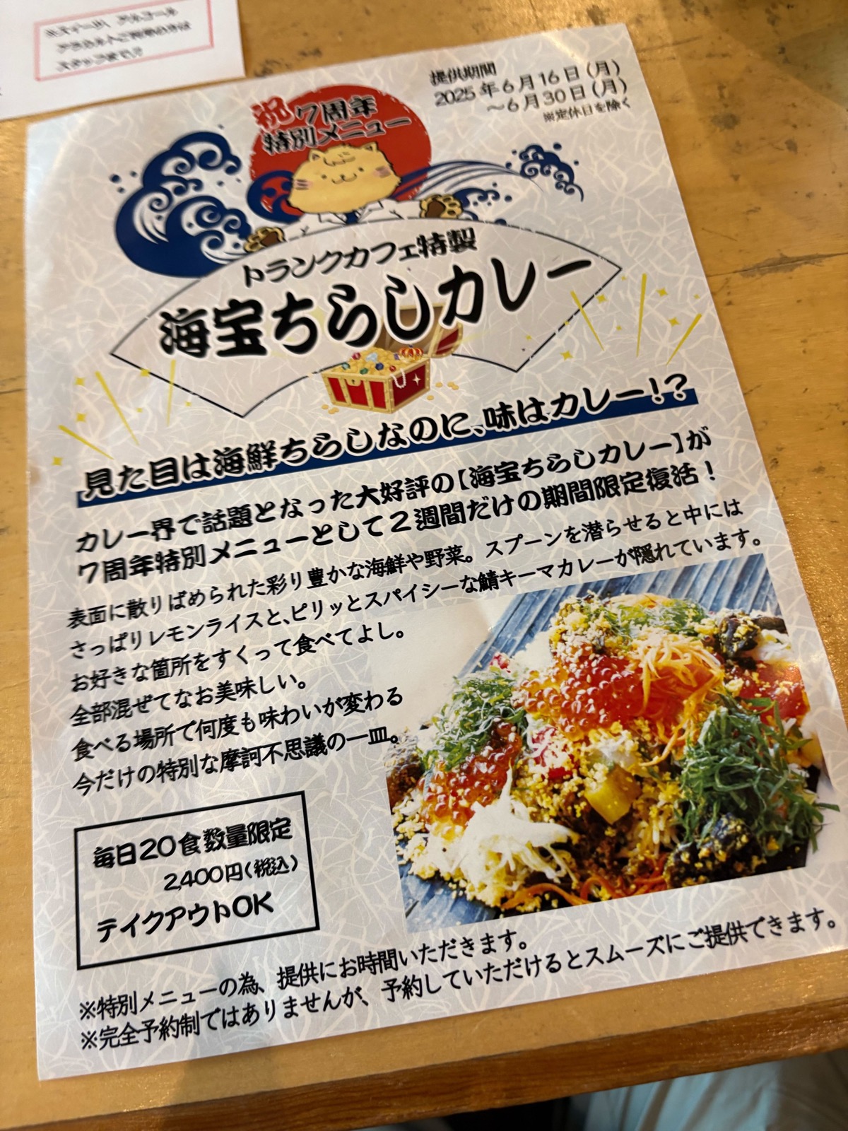 「見た目は海鮮ちらしなのに、味はカレー!?」というコピーが踊る。何とTRUNK CAFEでは店の創業を祝う周年のこの時期に変わり種のカレーを期間限定で提供しているという。