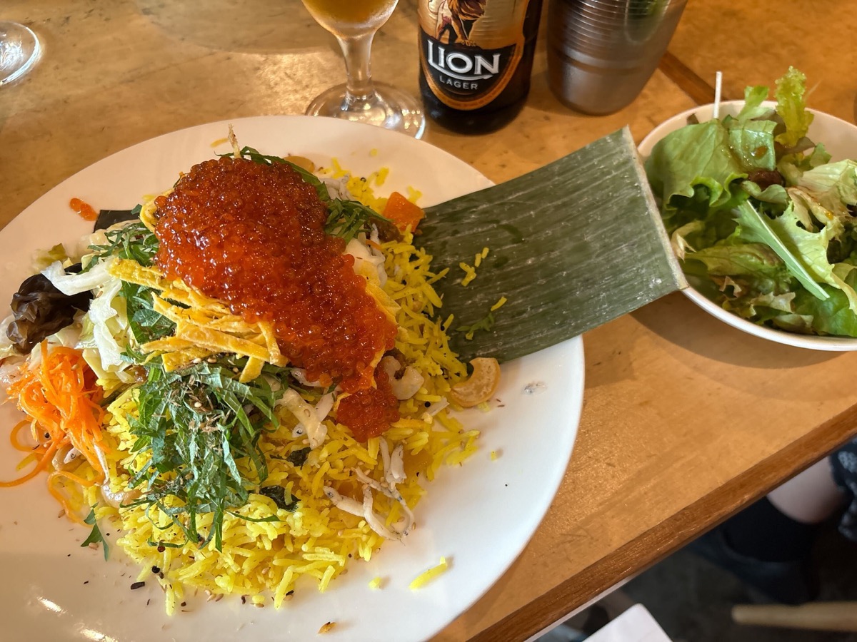 そして数分後に提供されたのがにわかには信じ難いヴィジュアルのイクラが大量に乗ったスパイスカレー&サラダ。盛り付けにはバナナリーフを使用しており、同店のシェフがカレーやスパイス料理に造詣が深いことは明らかと言ったところ。