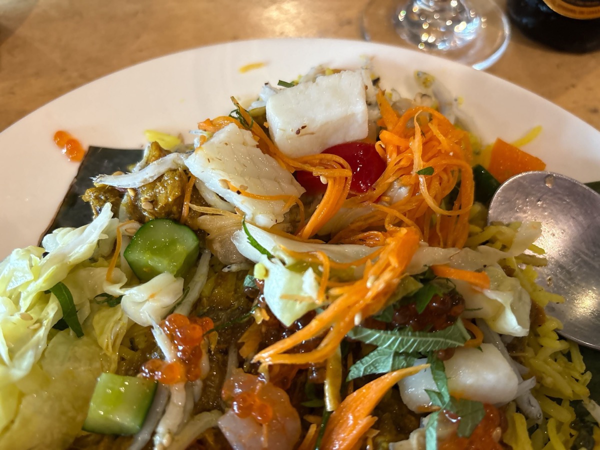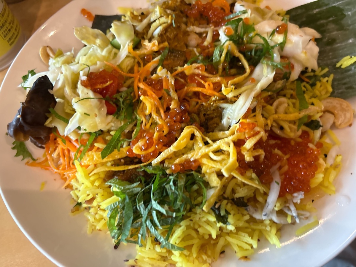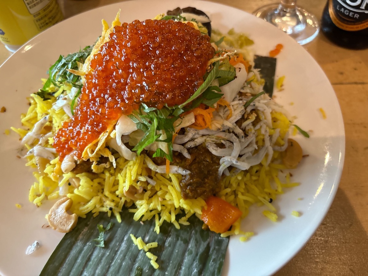 イクラやシラス以外にもイカ、エビ、ホタテ、アサリなどの色とりどりの海鮮も添えられている。イカ、エビ、ホタテ、アサリはシーフードカレーの常連だがイクラやスパイスカレーとの相性は果たして。