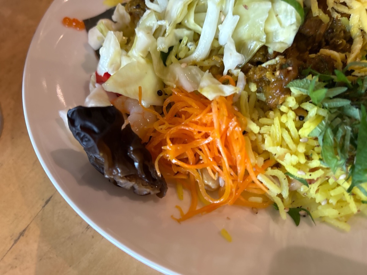 ニンジンとスパイスを和えたキャロットラペ、肉厚なキクラゲとキャベツのアチャール(ピクルス)、カラフルなパプリカなどが鎮座ましましている。