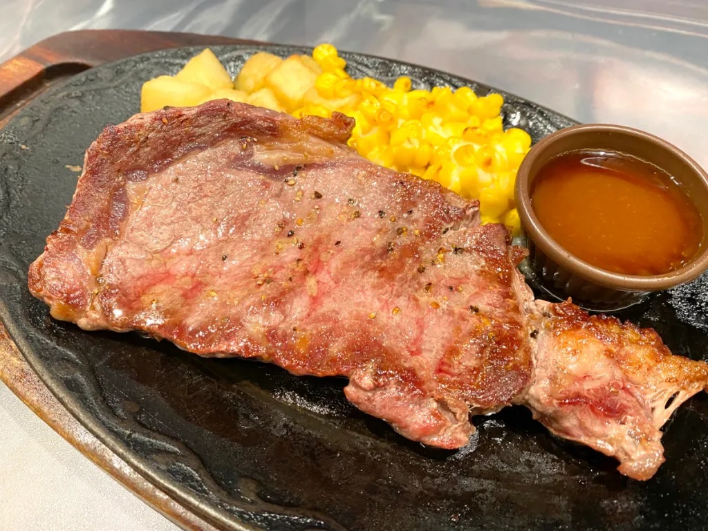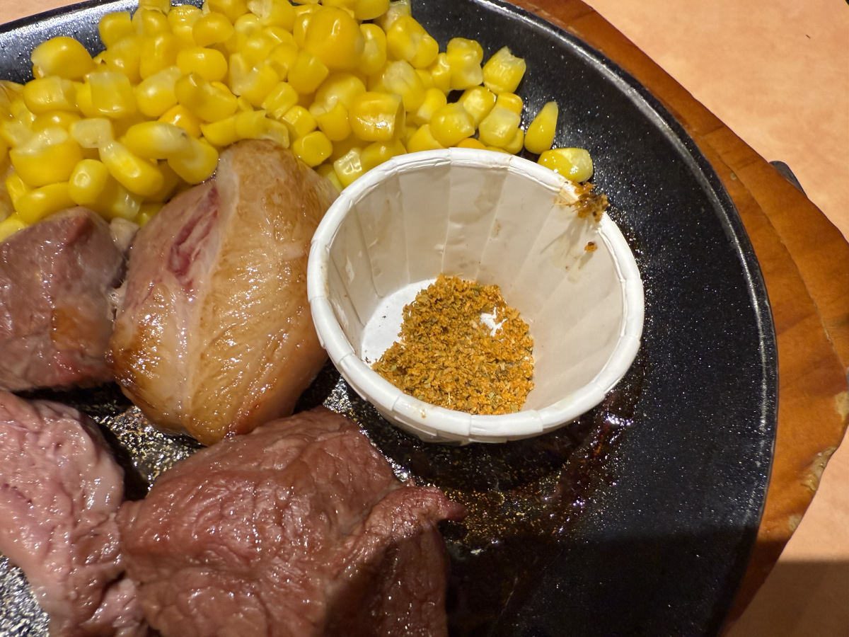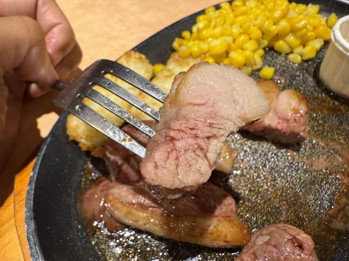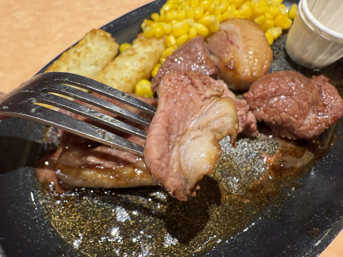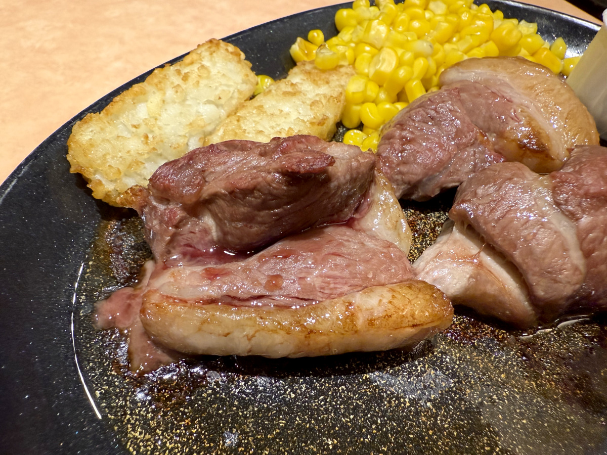 で、やって来たのは3つの肉塊。大きさにムラはあるものの、全体的に「超ボリューミー!」という感じではない。どちらかと言えばやや小ぶりな肉が3つ鉄板にのっているという印象だ。