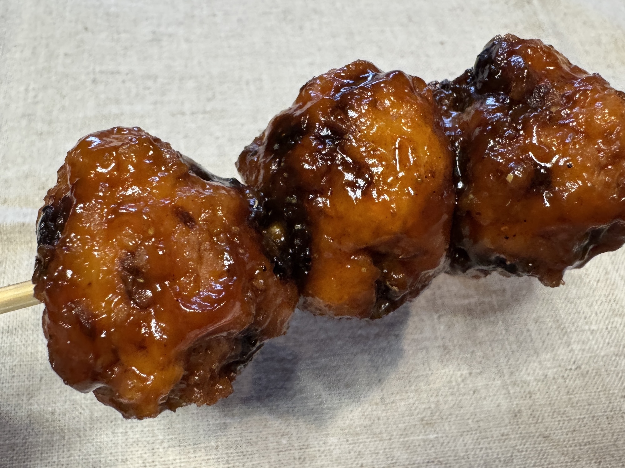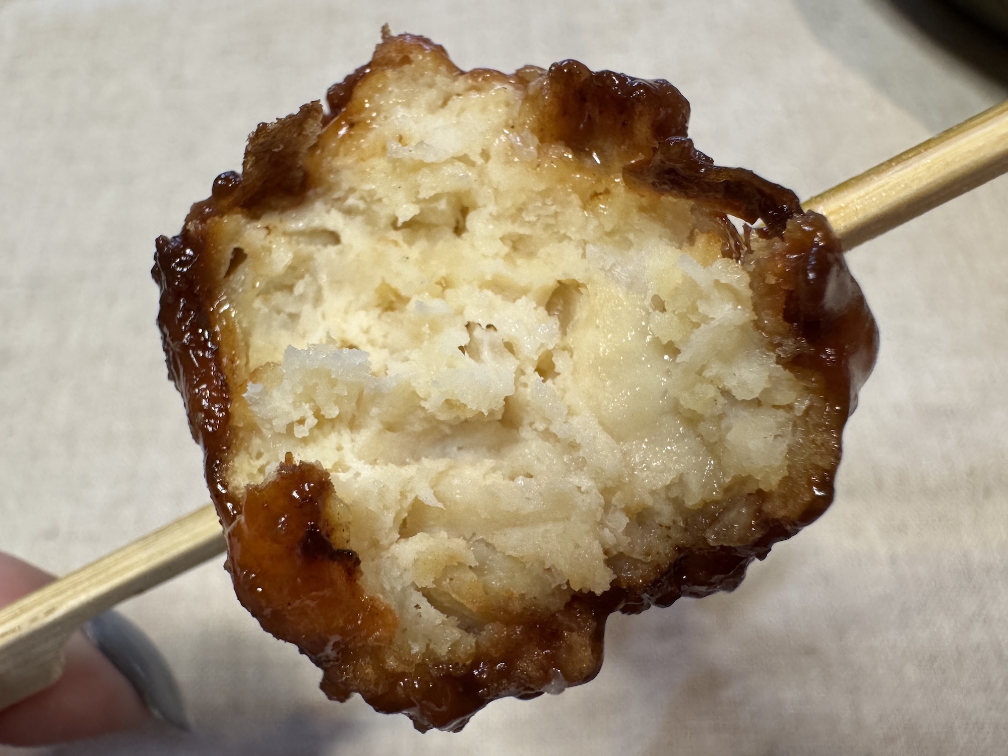 見た目はハンバーグというより「つくね串」であるが、まぁ原材料はほぼ同じだ。ばくだん岩みたいにボコボコとした感じがいかにもオオサンショウウオっぽい(?)。