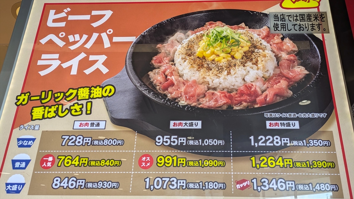 ……でも 先日店の前を通りかかった時、『ビーフペッパーライス』という初めて見るメニューがイチオシされていて興味が湧いた。なんだそれ? っていうか、よく見たらお値段約1000円なの!?