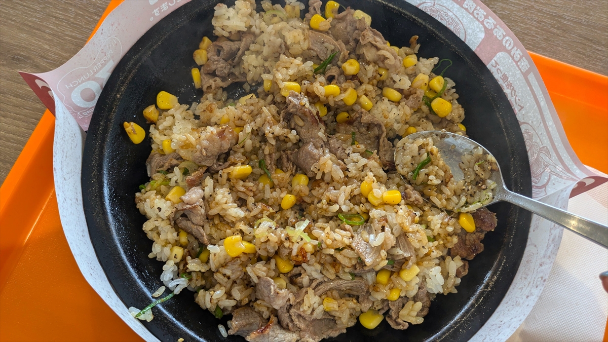 思わず独り言が出た。ガツンと効いたにんにく、キリリと辛い胡椒、食べ応えの増すバターの味と香り、ところどころカリッと食感のおこげ、ジューシーな甘みとシャキシャキした食感のコーン、そして噛むほどに旨味が増す牛肉。