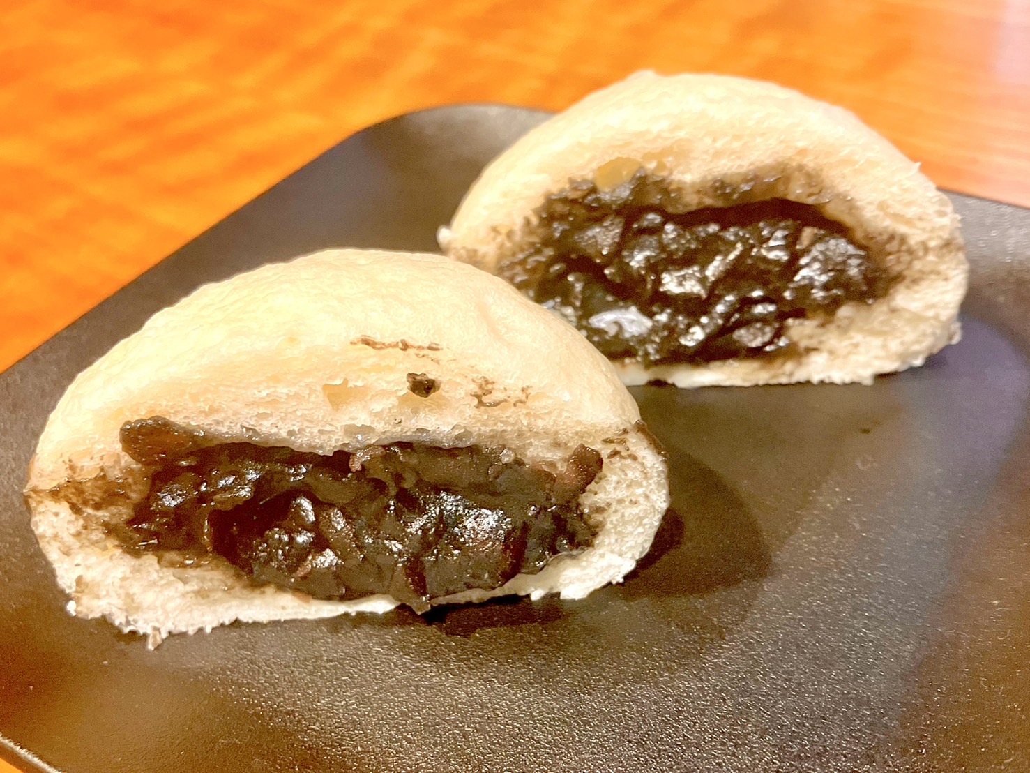 半分に切ってみるとこんな感じ。こちらはあんまんよりも具材の粒が大きく粘度が少ないため、切った直後に中身がこぼれてしまった。