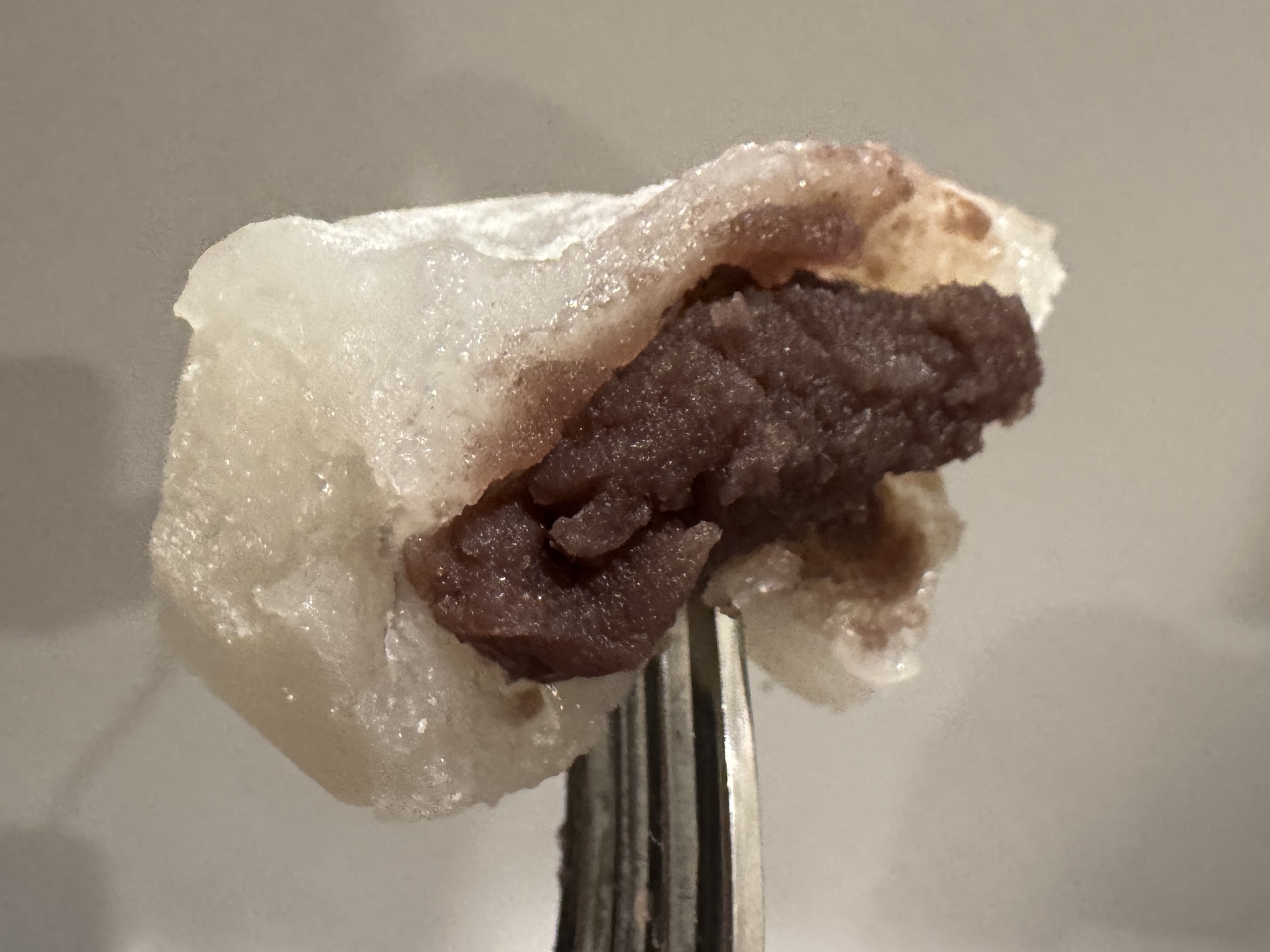 柔らかすぎて逆にフォークが刺さらないほどだったが、どうにか分割してみると中にはアンコが。見た目は完全にモチだ。果たして餅ういろうの実態とは……?