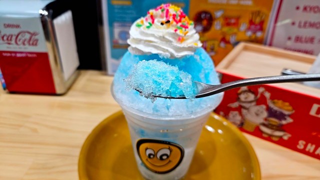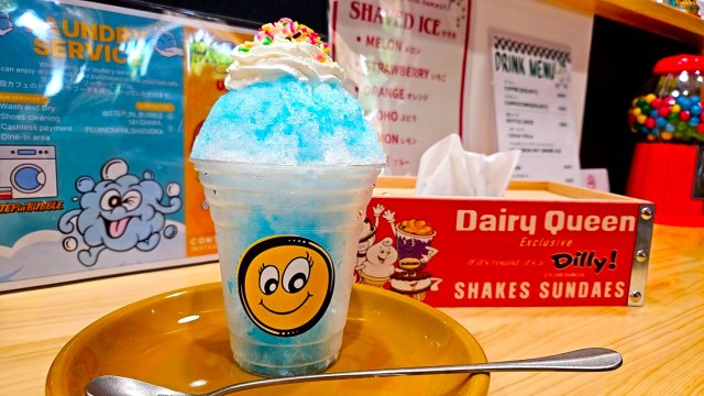 今回は「かき氷 ブルー ホイップ付き(税込350円)」をチョイス。ロゴがあしらわれた容器がイイ感じ。