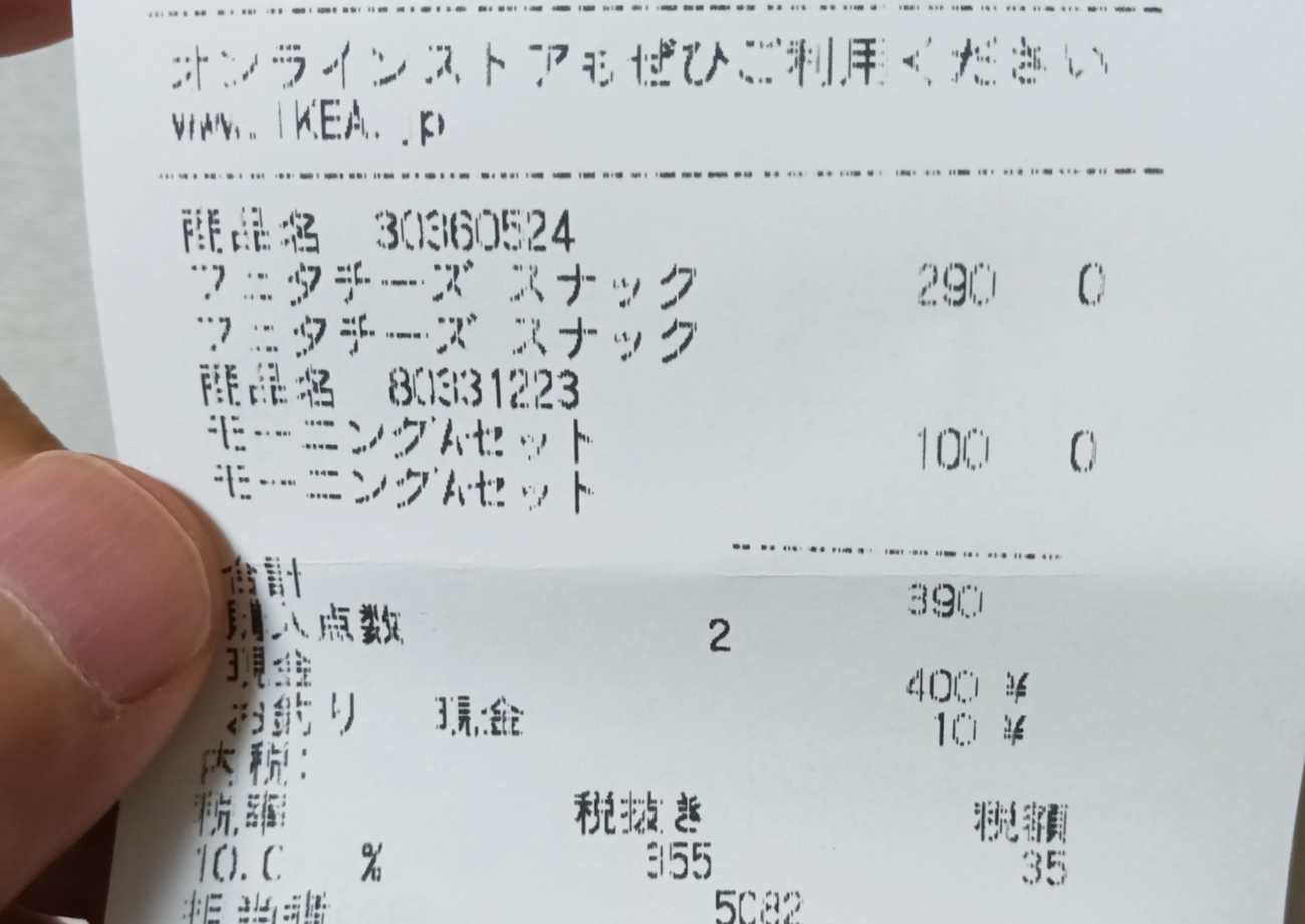 モーニングAセットは確かに100円だったけど、店員さんによるとフェタチーズスナックは290円らしい。よく見ると隣の値札が重なって0が隠れてしまっていたのだ。いや、だよね! さすがにおかしいと思ったよ。でも、「イケアならあるいは……」と思わせる何かがあったことは確かである。今考えると完全に罠にかかる時のムーブだ。