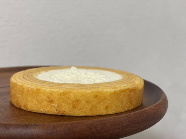 バウム生地はしっとりとしていて、口どけがやわらかい。水分が多めで、一般的なバウムクーヘンにありがちなパサつきは感じられない。