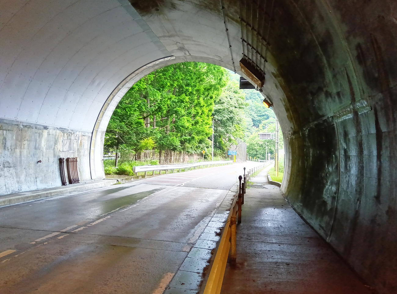 そんな感じでしばらく歩いているとトンネルが姿を現した。「日原トンネル」という名前のそのトンネルは1100mあるらしい。これまで歩いた距離を考えると1.1kmは短い。トンネルの中に歩道も設置されているし危険もなさそうだ。余裕やろ。