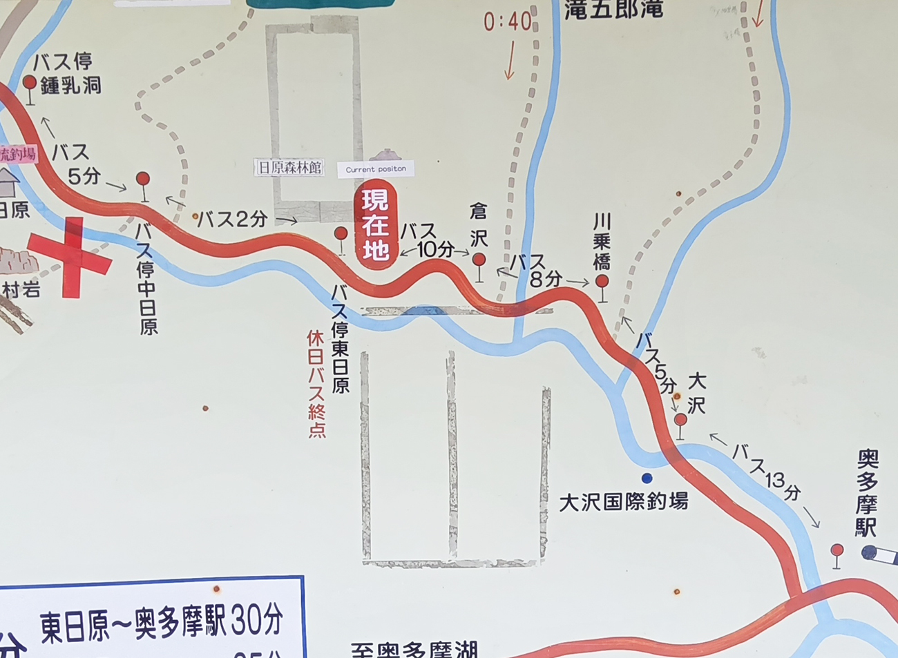 結構歩いたなあ。そこで少し休憩する気持ちで、バス停に貼られていたマップを見ていたところ、本当に思ったより進んでた。これ、あと半分ちょっとじゃね? 戻ってバス待つよりそのまま歩いて下山した方が早くないだろうか?