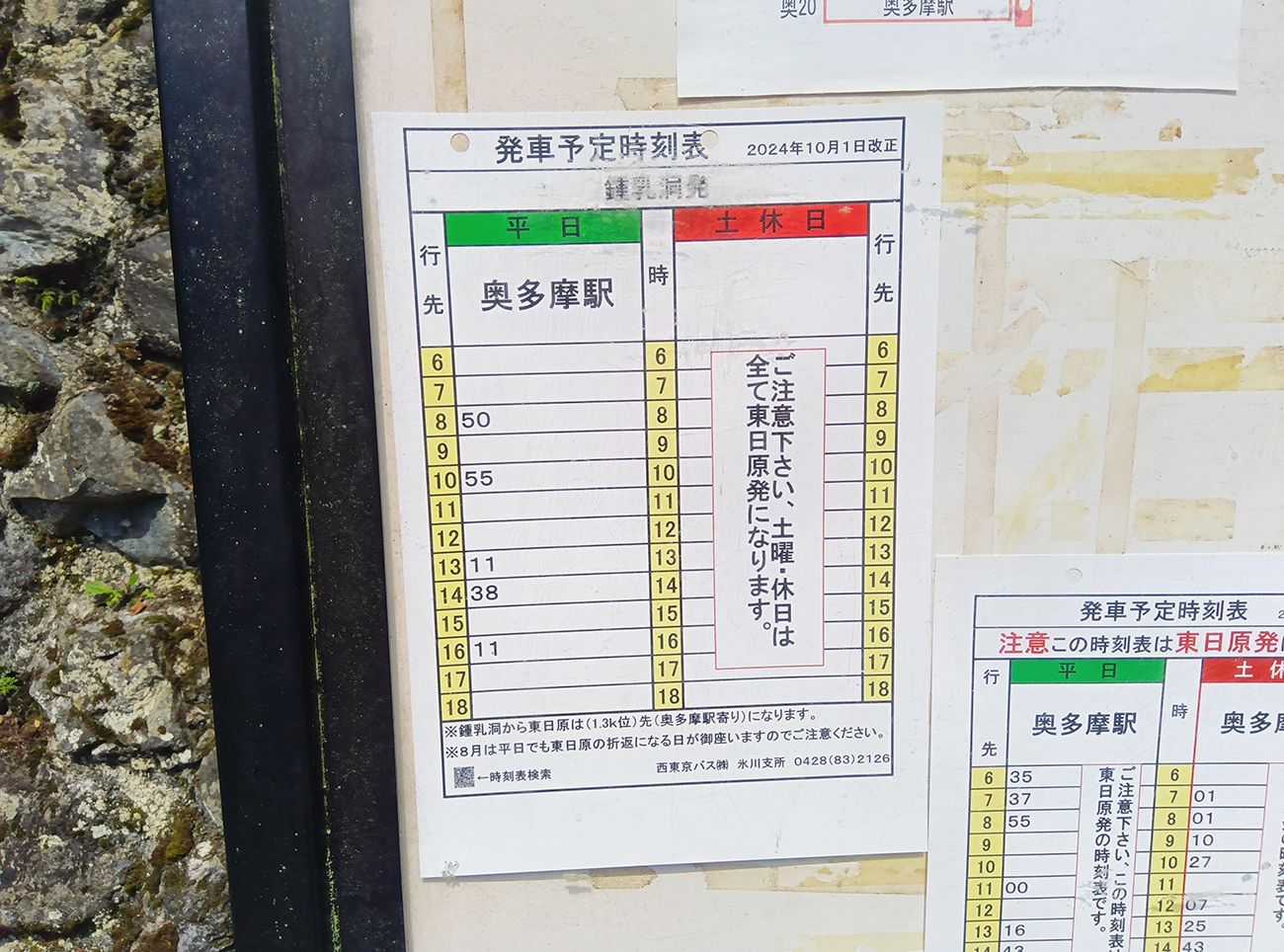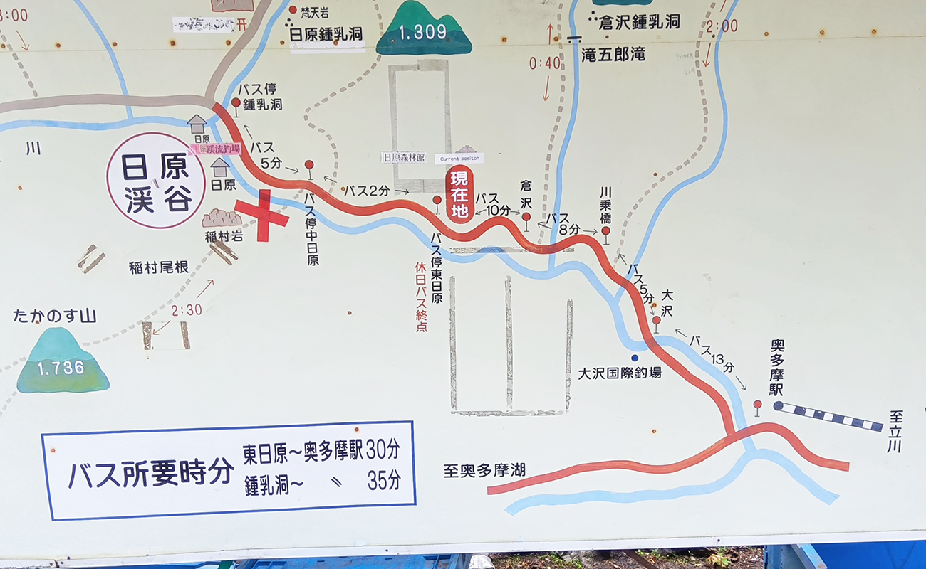 なぜ、こんな状況になってしまったのか? それはさかのぼること30分前のある思いつきがキッカケだった。以前の記事で、奥多摩山中の日原鍾乳洞に行ったことをお伝えしたが、見終わって最寄りのバス停「鍾乳洞」に着いたところ、次のバスは1時間32分後だった。