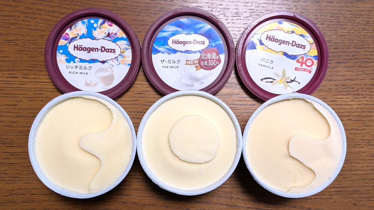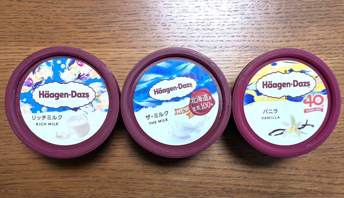 近所のスーパーで購入した ハーゲンダッツの「リッチミルク」「ザ・ミルク」「バニラ」の3種。