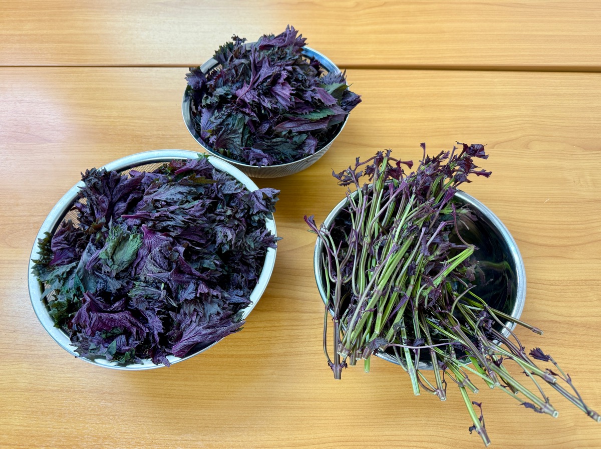 その1:赤しその葉と茎を分離させる。必要なのは葉っぱだけ。