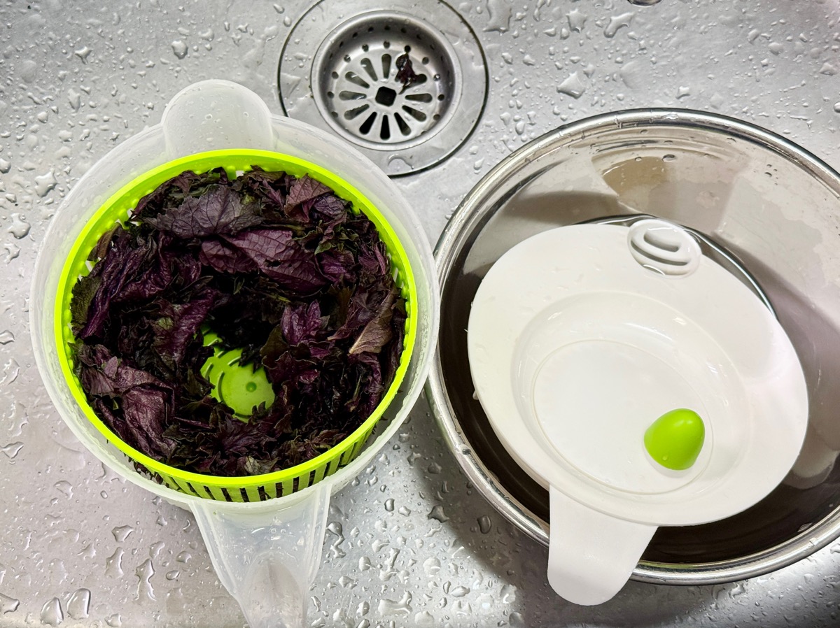 その2:赤しそを水洗いして、水切り器などで水分を飛ばす。