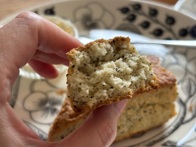 というわけで、いただきます。手で割るのはわりと簡単。ボロボロ崩れるような硬いスコーンではない。