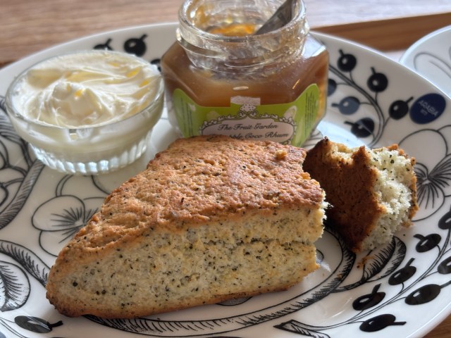 そしてスコーン自体の甘みが強くなく、ほどよくパサパサしてるので、クロテッドクリームをつけたり、ジャムをつけたりしてアレンジする楽しみもある。