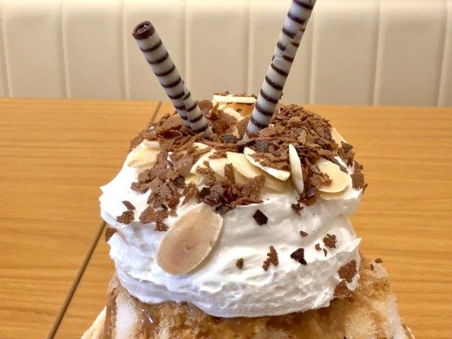 トッピングと一緒に食べると氷の冷たさだけでなく、ホイップクリームのまろやかなクリーム感や、アーモンド&チョコフレークのサクサク感が入り混じる。まったく違った食感が口の中でマリアージュ。これはもうケーキ!