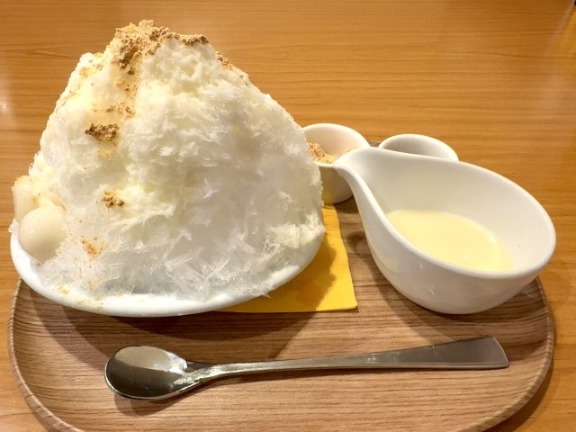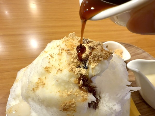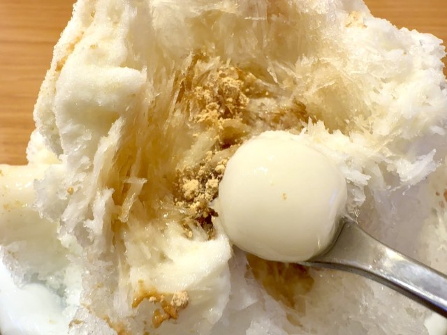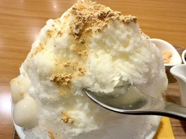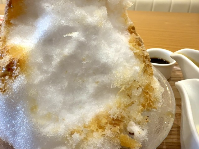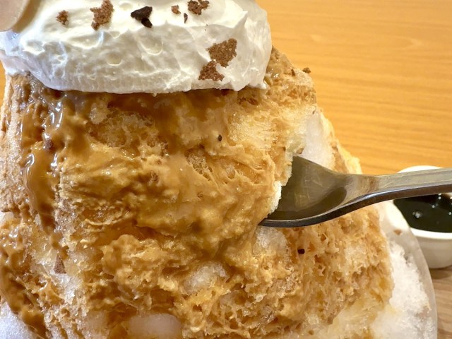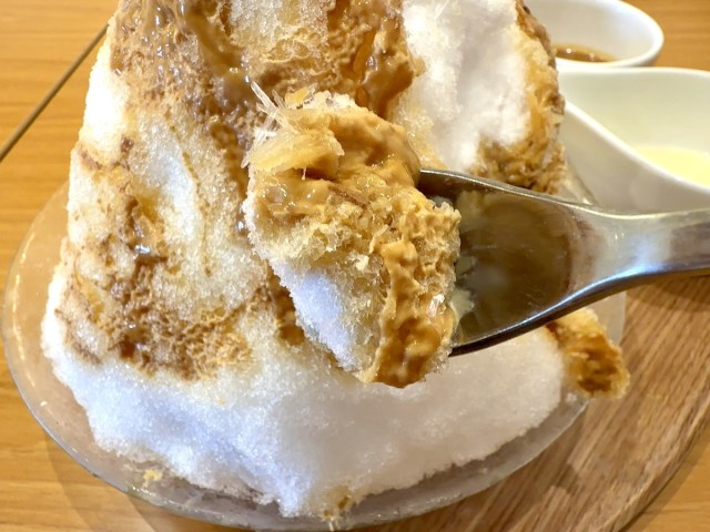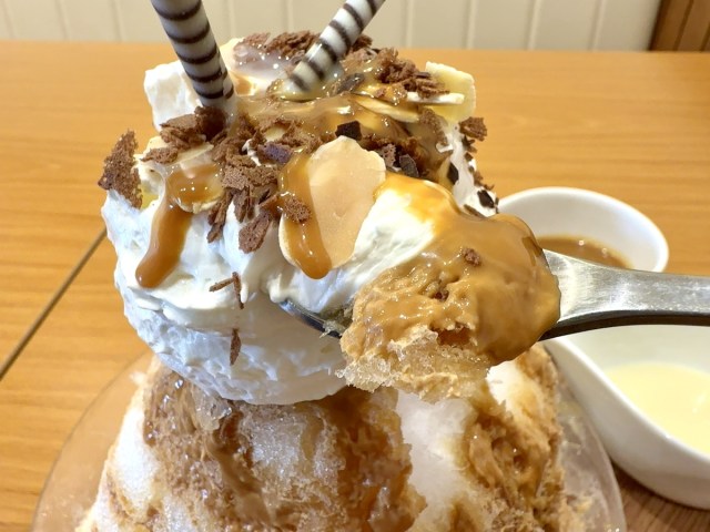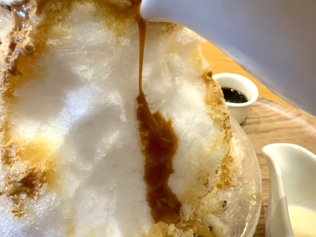 氷は時間をかけて凍らせた「純氷(じゅんぴょう)」で、粉雪のようなさらさらの質感。スキー場で例えるならパウダースノーだ。そこにキャラメルシロップがこれでもかとかかっている。