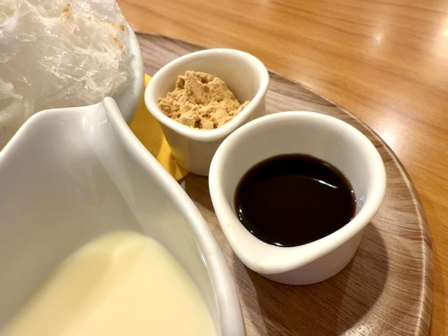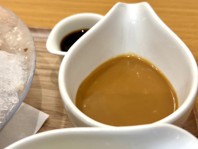 味変のための「別添えシロップ」はココスのかき氷の代名詞だ。今回はコーヒーシロップ、キャラメルシロップ、ミルクシロップが付属。写真ではわかりにくいが、どれもカップほどもある容器に、たっぷり入っている。「味が足りない」という事態には決してならないだろう。