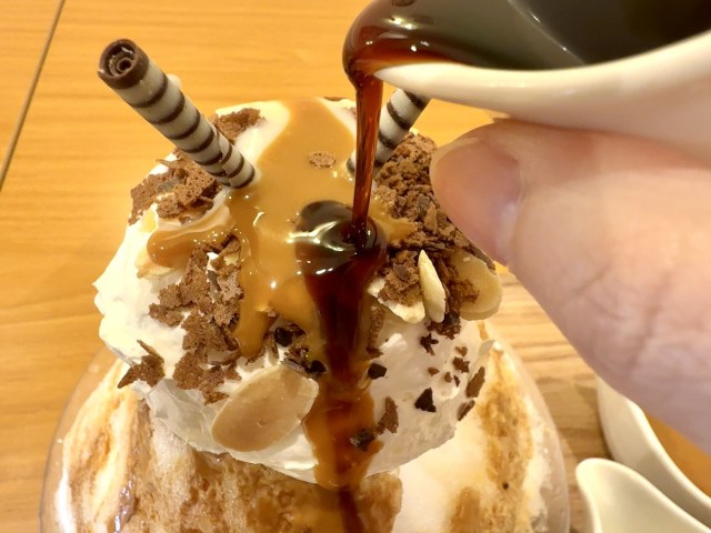 かき氷は一般的には「涼しげで」「爽やかな」食べ物のイメージがあると思うけれど、ココスのアイテムは毎年ひと味違う。新フレーバーの「キャラメルマキアート」も、ビジュアルからして存在感強め。
