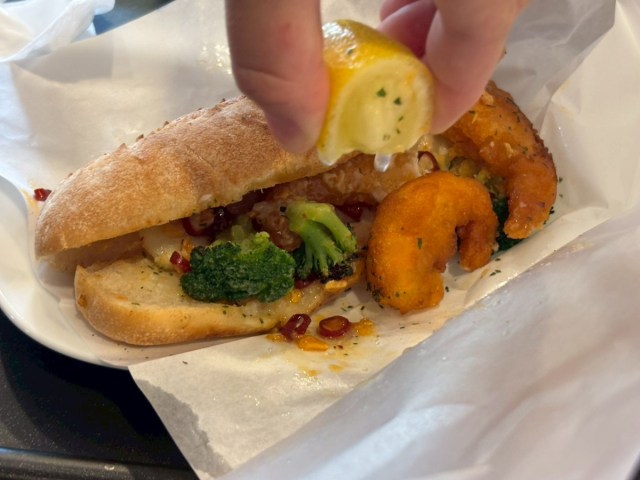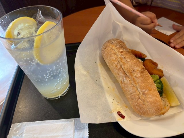 この中から今回は、「焼きたてサンド ガーリックシュリンプ」と、同じく新商品の「さわやかレモンスカッシュ(530円)」を注文してみた。