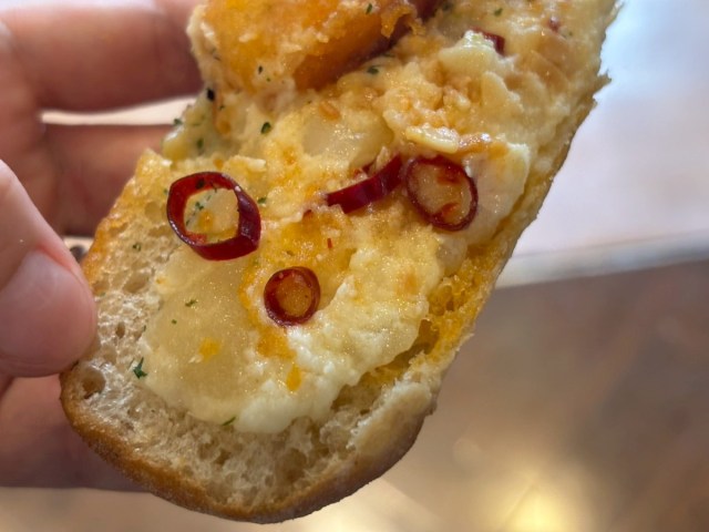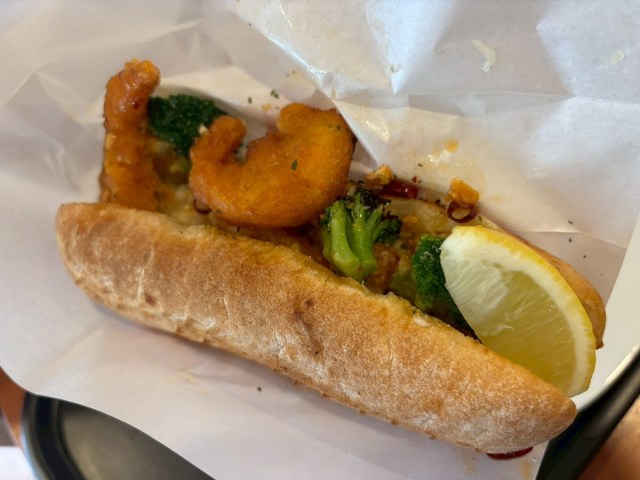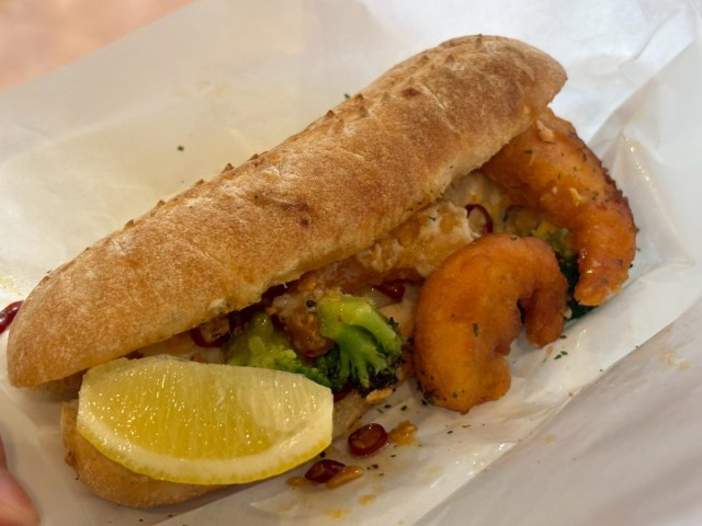 ハワイ名物のガーリックシュリンプをベローチェ流にアレンジした焼きたてサンドで、殻付き海老にポテトサラダ、ブロッコリー、マスタード入りマヨソースという独特な組み合わせ。