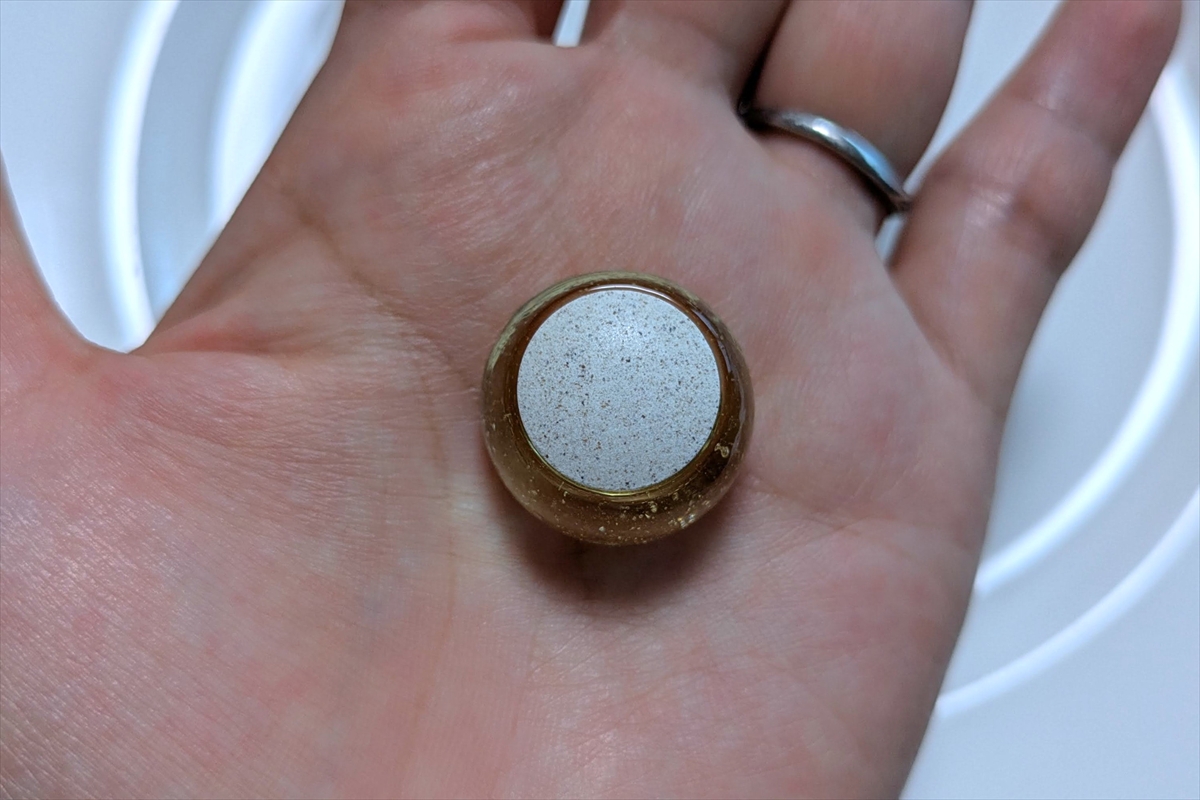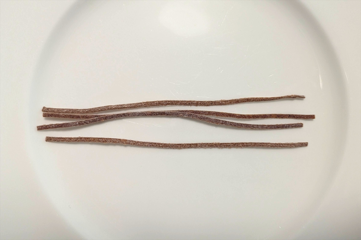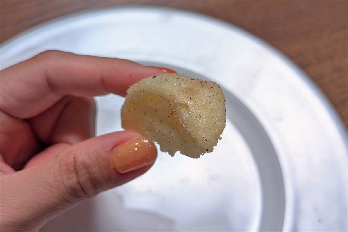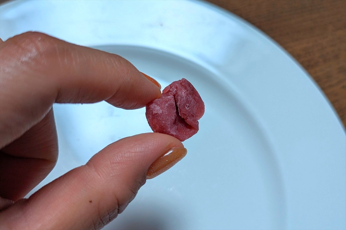 ねり梅のようでありながらどこか人工的で、乾いた粘土を齧っているよう(だけど不快ではない)。歯に挟まりやすい欠点はあるけど、この食感は癖になっちゃいそうだ。
