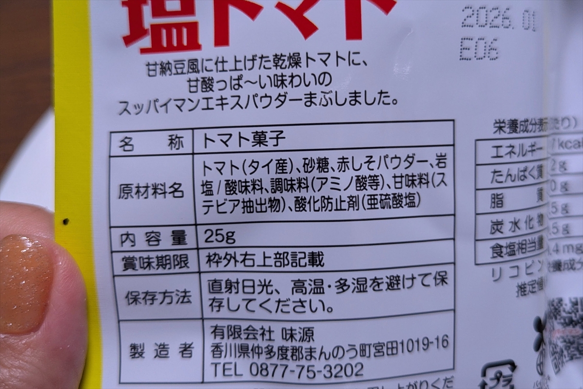 梅干しらしいエッセンスとしては、赤しそパウダーと酸味料のみ。「スッパイマン味」じゃなくて「スッパイマンに似た味付けをしたトマト」ってことなの!?