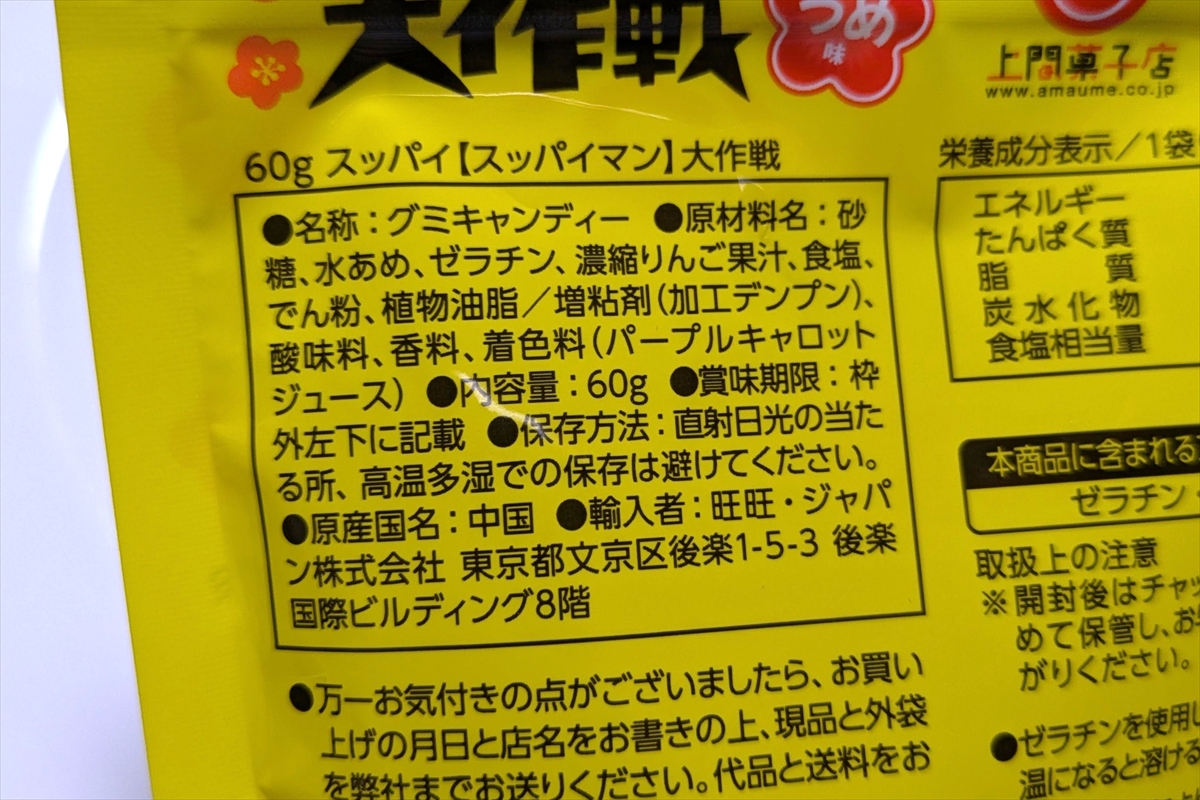 梅の食感がないだけでとほぼスッパイマンと言っても過言ではない。チャックもついてるし、手が汚れないし、外出先で食べるのによさそうだね。