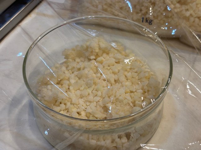 食べたことのない人のために「カリフラワーライス」がどんなものか説明すると、カリフラワーを細かく刻んで米っぽく見立てた食べ物です。正体は、米粒大に刻んだカリフラワー。