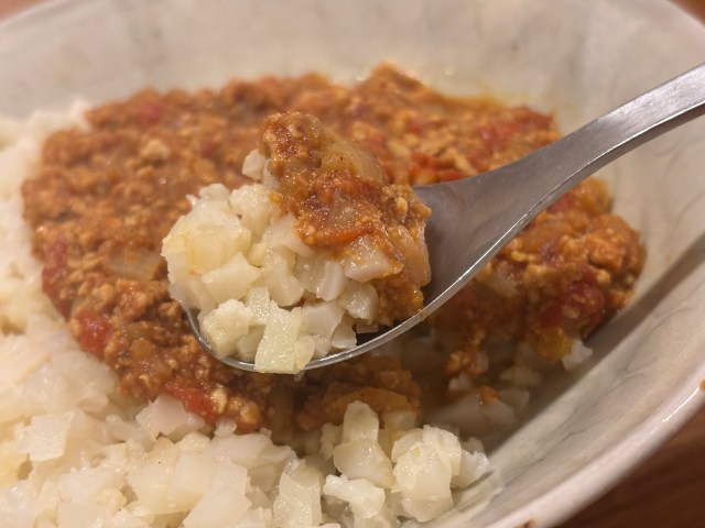 まず、相性がいいのがカレー。CoCo壱でも低糖質カレーと銘打って、カリフラワーライスの提供をしているように、カレーをかけて食べると、独特のカリフラワーの香りも気にならない。