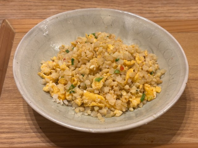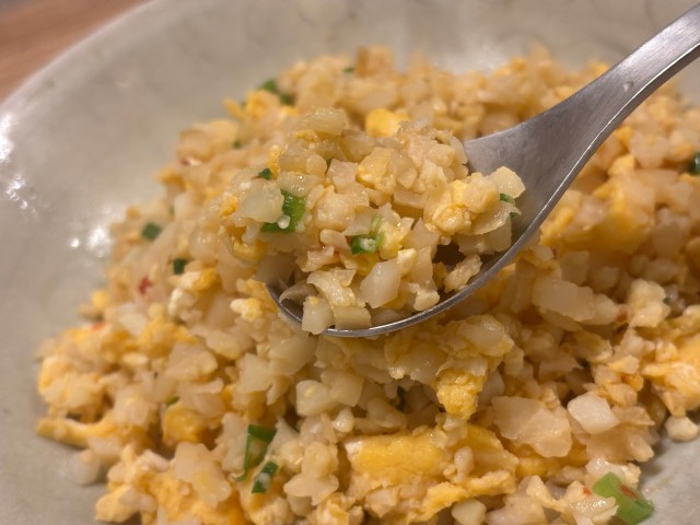 カリフラワーライスはパラパラしているので、チャーハンにピッタリ。そして、出来上がりも米で作ったチャーハンそっくりである。