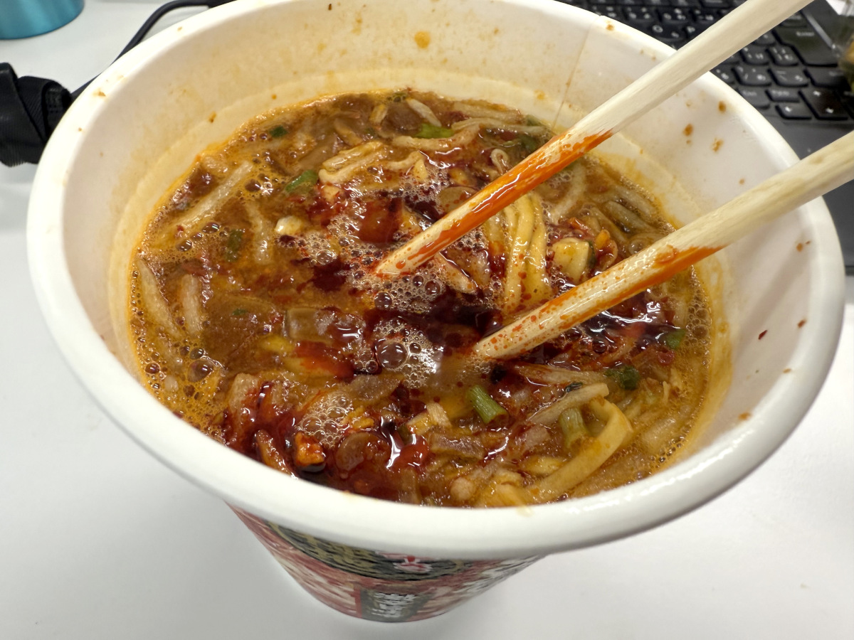 それでも何とか負けずに旨味がついて行っているのが秀逸なところで、これが中本や製造元である日清食品の凄さなのだろう。圧倒的な辛さを演出しつつ、しっかりウマいと思えるのは流石の一言だ。