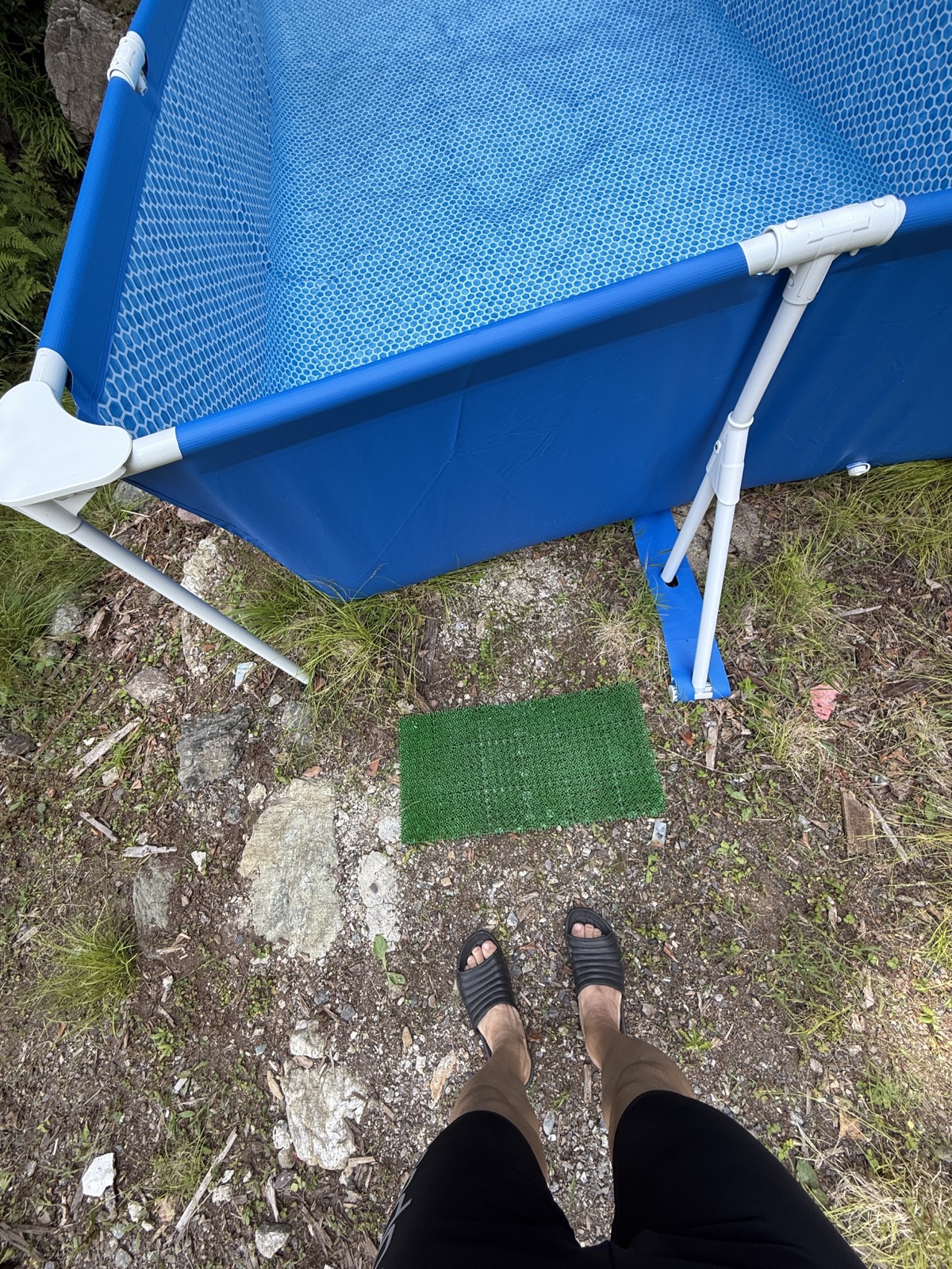 入り口(スリッパ脱ぎ場)として超最適なのであった。人工芝の手前でスリッパを脱いで、人工芝からプールへ入水。あがる時も、人工芝に着地してスリッパを履けば泥で足が汚れない。