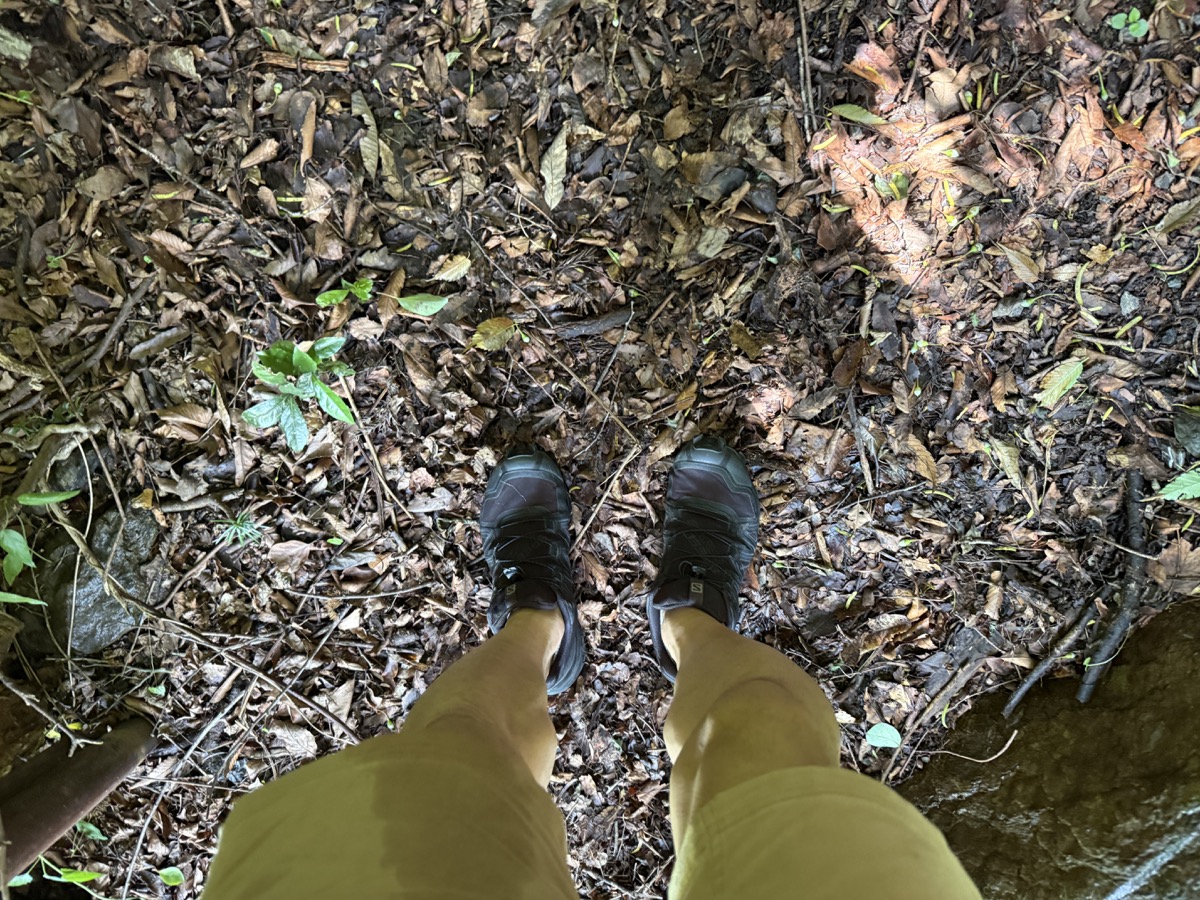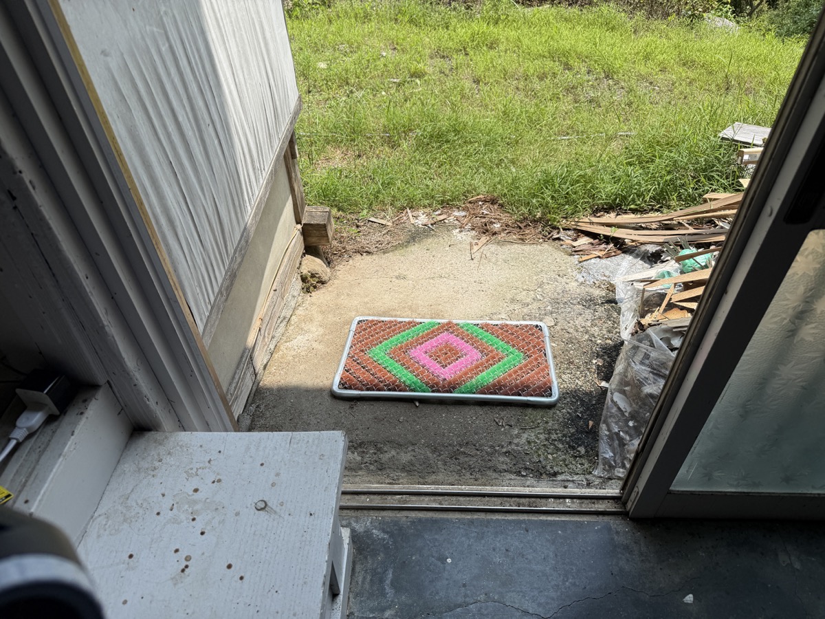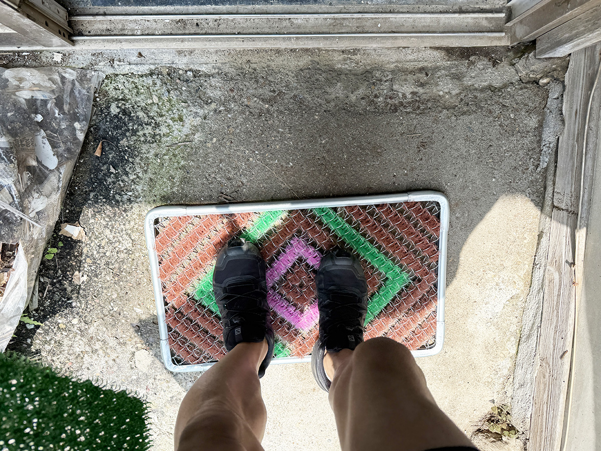 それを落とそうと、古民家の中に放置されていた2枚の「100均で買ったらしき人工芝」を連結し玄関先に置いてみたところ……これがメチャメチャ最高だった。