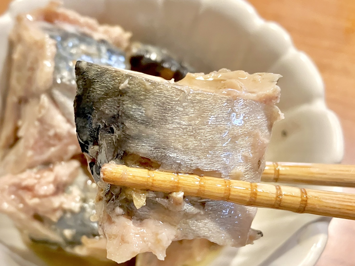 蓋を開けてみるとこんな感じ。サヴァ缶とは形が違うけど、こちらも隙間なく鯖の身が詰められている。口の中に入れてみると……