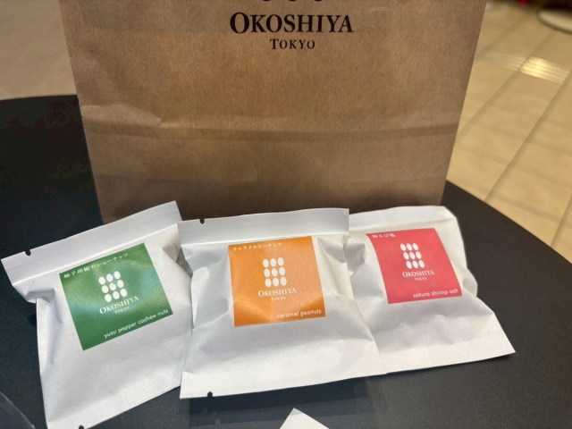 今回は、スタッフおすすめの「柚子胡椒カシューナッツ」と人気No.1の「キャラメルピーナッツ」、さらに七夕イベントでプレゼントしていただいた「桜えび塩」を自宅で食べてみた。