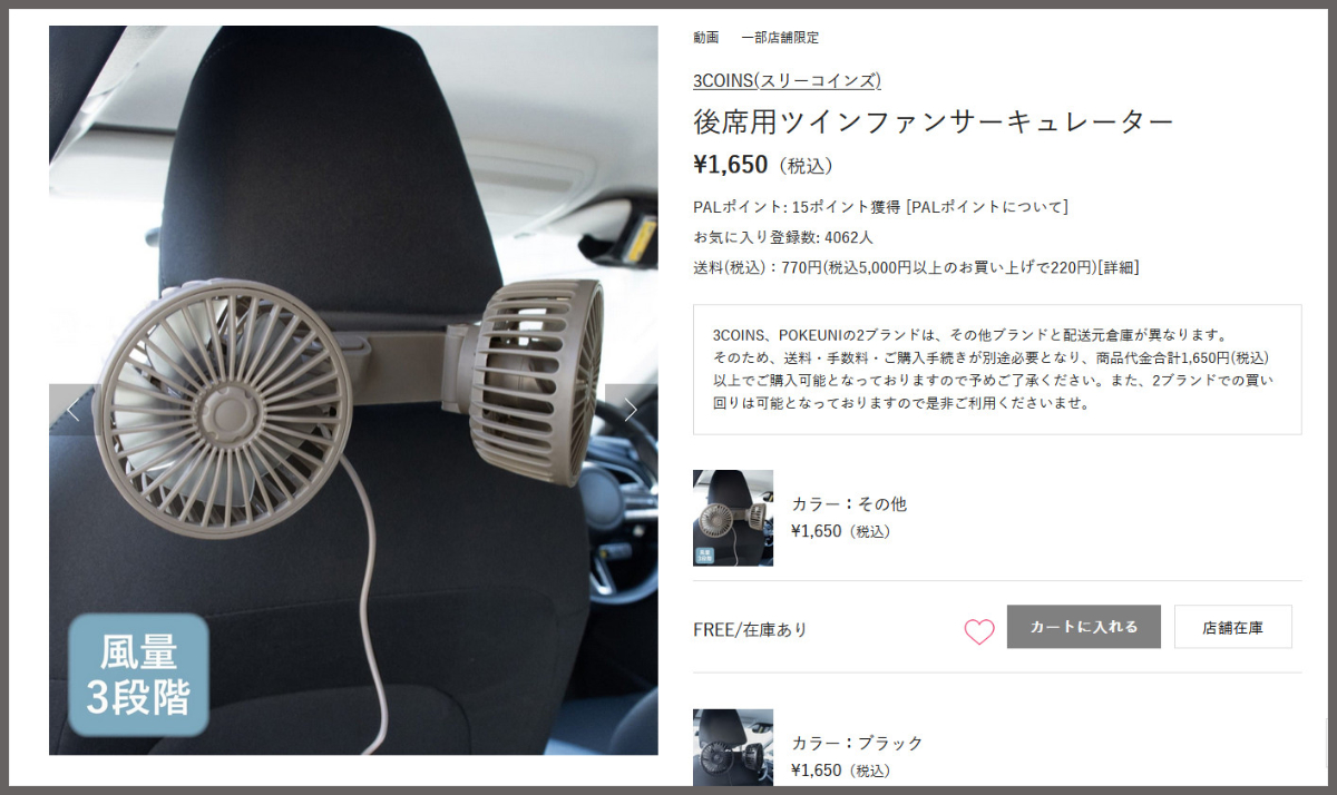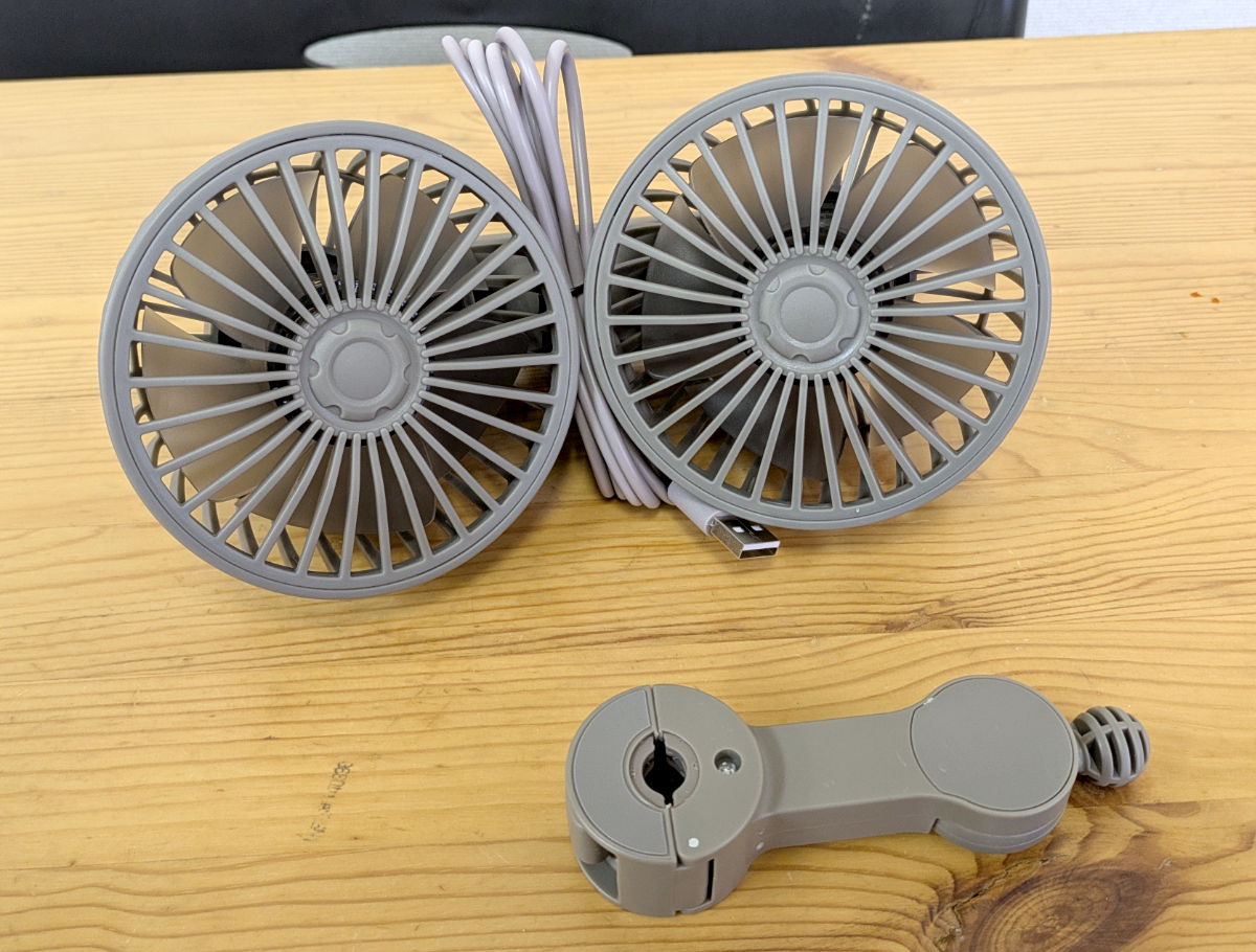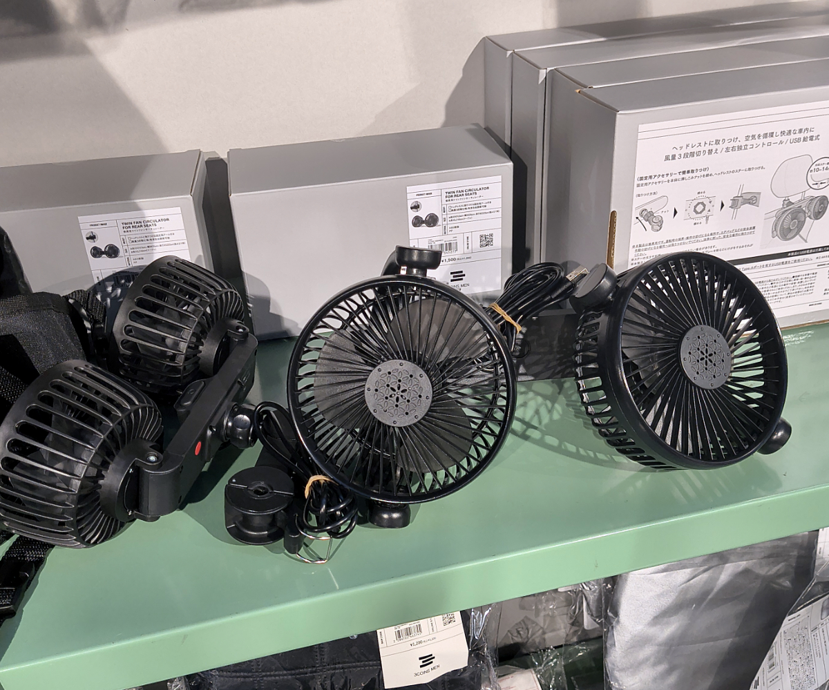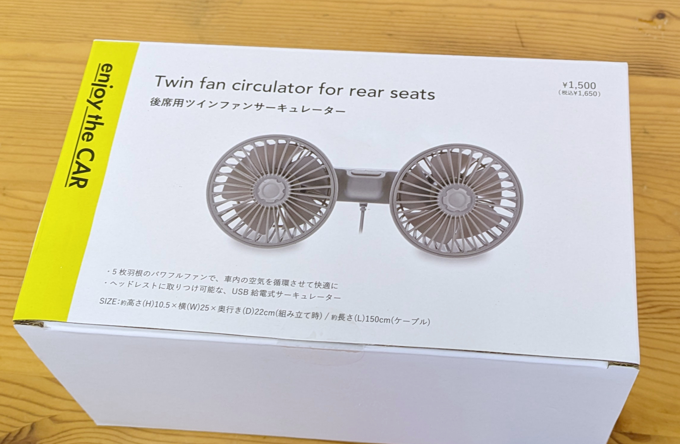 堪りかねた私(佐藤)はスリーコインズでサーキュレーターを買ってきた。手持ちのハンディファンではなく、カー用品の「後席用ツインファンサーキュレーター」(税込1650円)である。