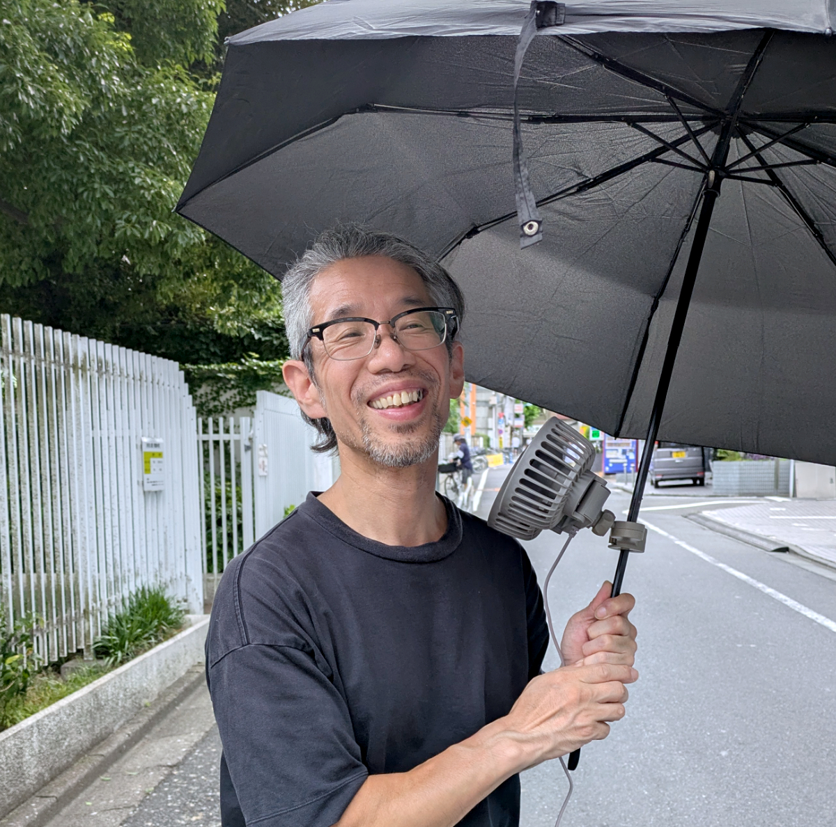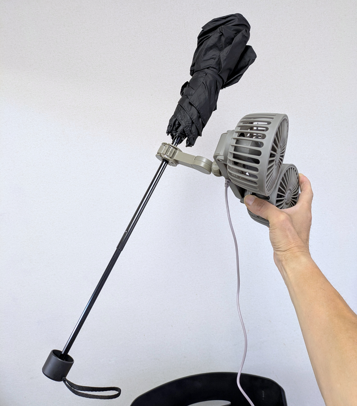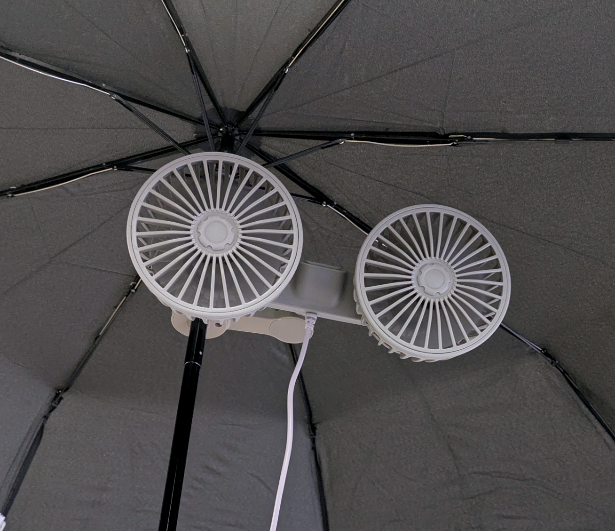 ハンディファンでも良いんだけど、手持ちの製品は片手がふさがってしまう。傘と併用すると両手がふさがることになるけど、これなら片手は自由だ。