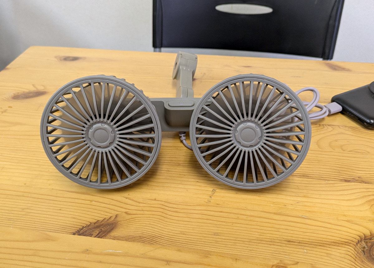 上の方にファンを取り付けて頭部に風を浴びたり、手元にファンを付けて顔に風を浴びたりできる。