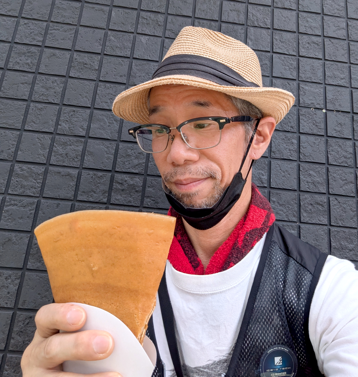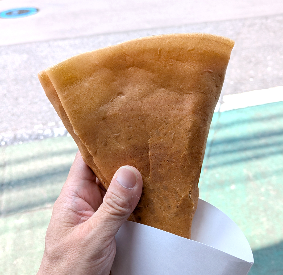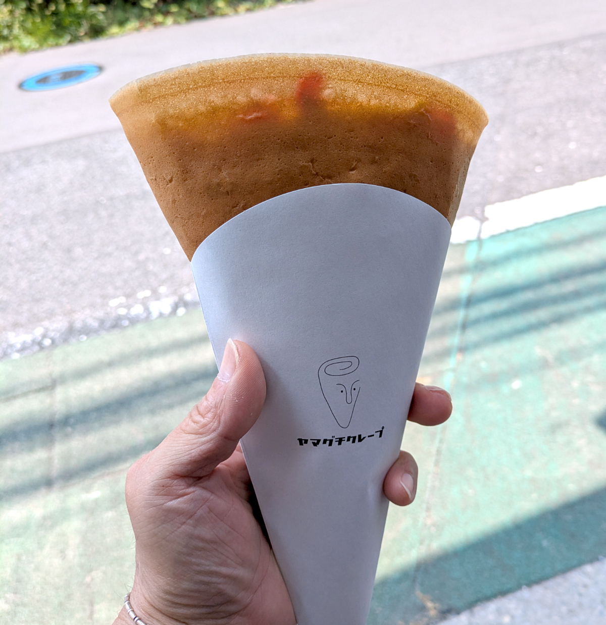 持った感触から、生地がしっかりしていることがわかる。クレープというと、ふにゃふにゃの生地という印象が強いが、ここのは今まで食べてきたクレープの中で1番硬いかもしれない。ふにゃっと折れそうな気配がない。