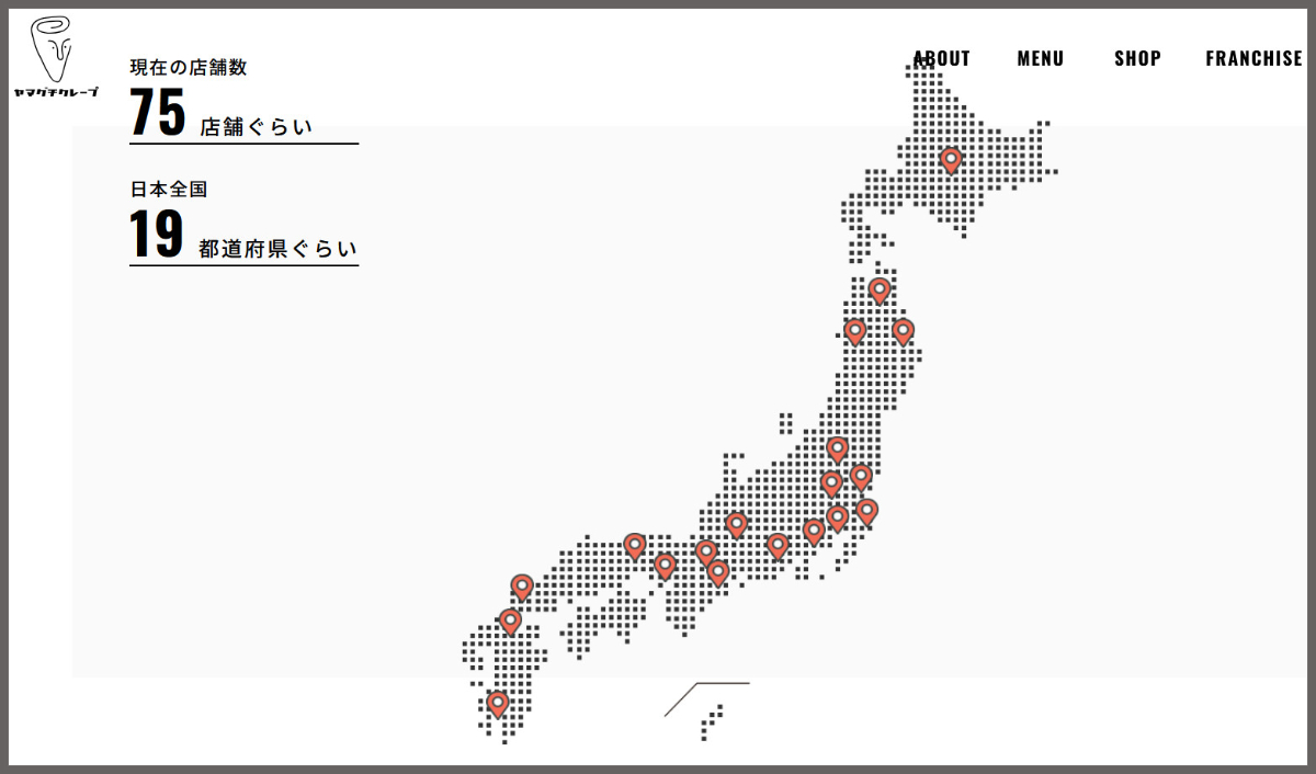 ヤマグチクレープの公式ページで店舗一覧を確認すると、現在(2025年7月)の店舗数は75店舗ぐらい。全国の19ぐらいの都道府県に出店しているそうだ。北は北海道から南は九州まで広く分布している。