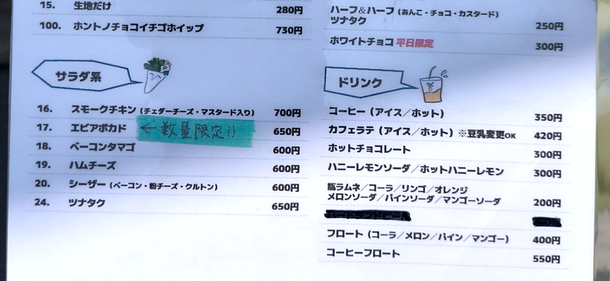 メニューを見ると、デザート系クレープは全部で17種。その中には「生地だけ」というのもある。