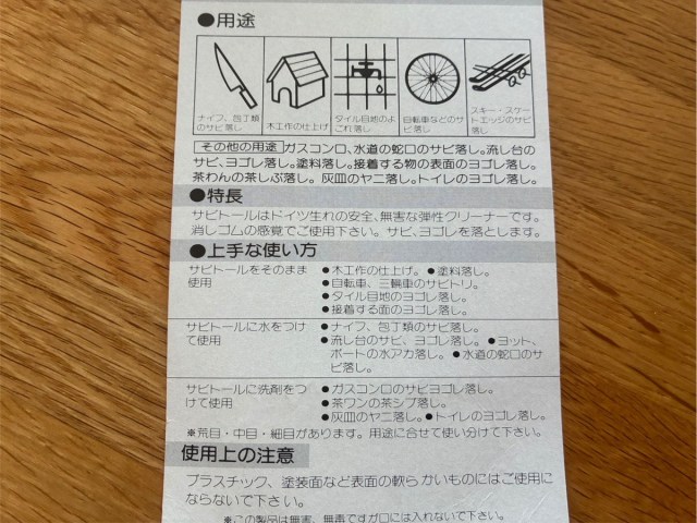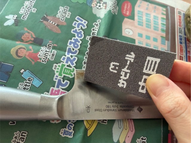 自宅に戻って早速開封。包丁のサビ取りには、水をつけてから使うらしい。
